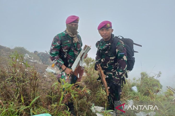 Personel Marinir menemukan puing pesawat ATR 42-500 di Lereng Gunung Bulusaraung, Kabupaten Pangkep, Sulawesi Selatan, Senin (19/1/2026). ANTARA/HO-Penmar TNI AL/aa.Kini, lanjut Nana, fokus personel Marinir yakni mencari dan mengevakuasi korban pesawat jatuh tersebut. Hingga kini proses pencarian yang dilakukan personel Marinir masih berlangsung.