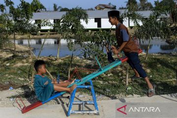 Sejumlah bocah bermain di taman bermain hunian sementara (Huntara) Danantara di Karang Baru Kabupaten Aceh Tamiang, Aceh, Minggu (25/1/2026). Sebanyak 600 unit huntara yang berada di dalam satu kawasan tersebut sudah mulai ditempati oleh warga korban bencana banjir bandang akhir November 2025. ANTARA FOTO/Nova Wahyudi/rwa.