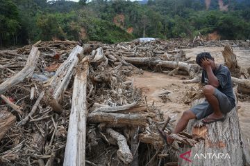 Warga duduk di antara tumpukan kayu yang menghancurkan rumahnya di Desa Aek Bontar, Kecamatan Tukka, Tapanuli Tengah, Sumatera Utara, Jumat (30/1/2026). Dua bulan pascabencana banjir bandang dan tanah longsor, masih ada empat desa di Kecamatan Tukka, Tapanuli Tengah yang terisolir yakni Desa Sigiring-Giring, Sait Kalangan II, Saur Manggita, dan Aek Bontar. ANTARA FOTO/Indrianto Eko Suwarso/agr